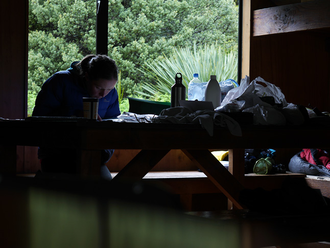 ニュージーランドはハットと呼ばれる山小屋がかなり充実しており、だいたい15~20kmおきにハットが建てられている。ハットは、日本の避難小屋にベッドと調理場が完備されているもの、とイメージするとよいと思う。ハットはニュージーランドのハイキング・カルチャーの特徴づけるものでもあるので、僕らもハットの利用を積極的に旅程に組みこんだ。