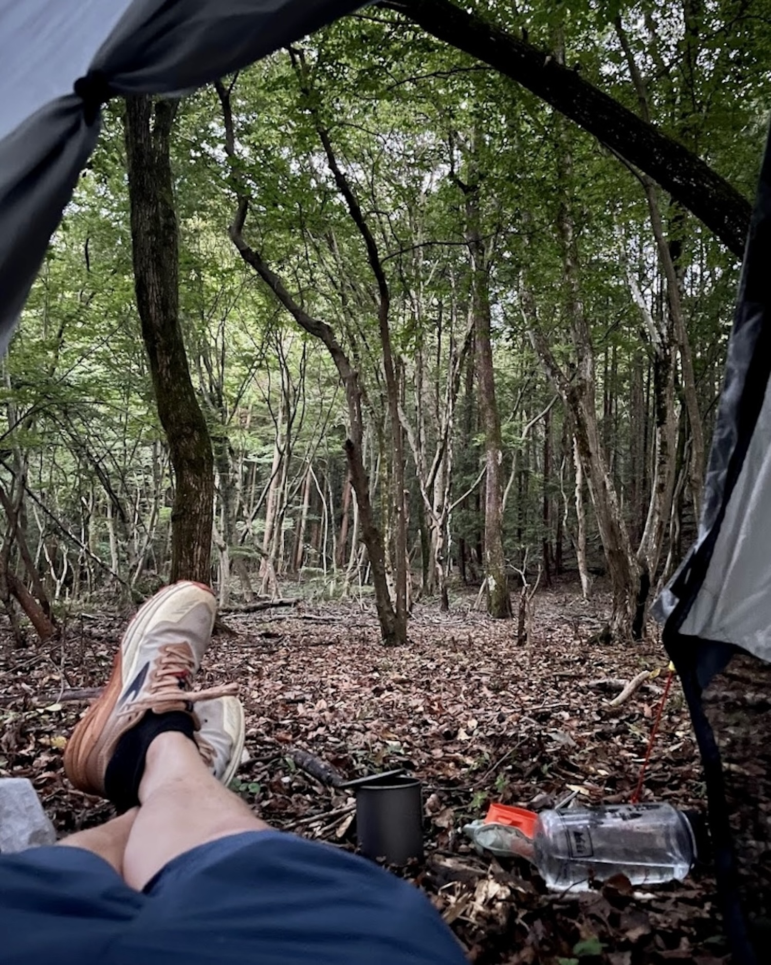 トレイルはもう一度樹林帯へ降りる。日没も早くなった。ヘッドライトが点く前にテントをピッチして、雑木林に横たわる。