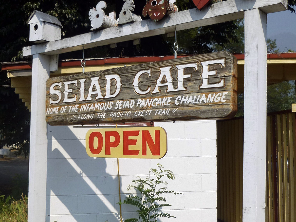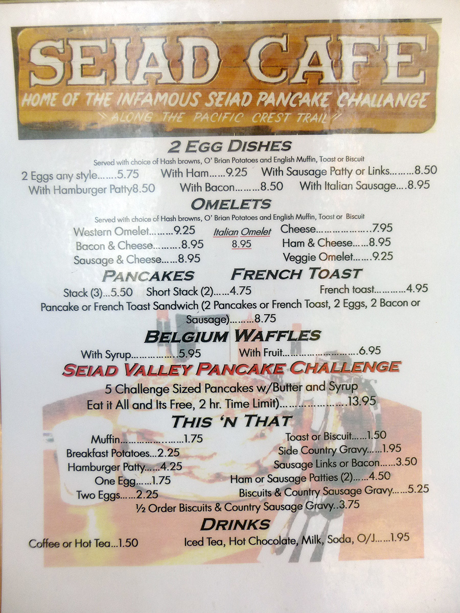 午後に町へ着いた僕は、グロサリーストアで食料を補給し、そのまま歩き出そうかと一瞬考えた。ただ急ぐ理由はなにもなかった。RVパークにはキャンプサイトもある。ここで一泊していってもいいじゃないかと、そう思ったとき、ふとひとつの名物が頭に浮かんだ。セイアドカフェのパンケーキチャレンジである。