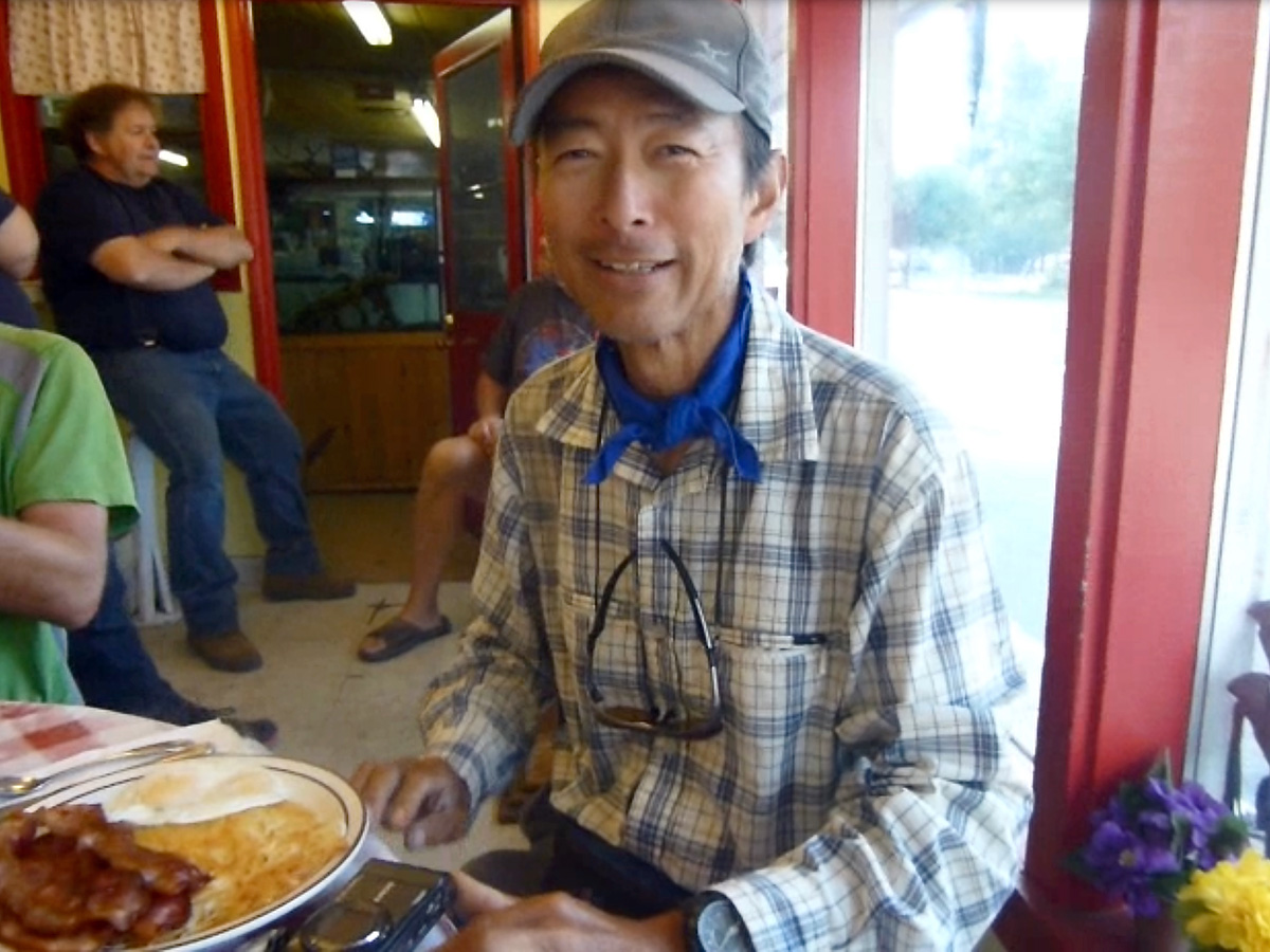 翌朝。開店したばかりのカフェに意気揚々と乗り込むと、偶然にも顔なじみのハイカー仲間が同じテーブルに集まった。日本人スルーハイカーの筧さん、Pacemaker (ペースメイカー)、そしてStonewall (ストーンウォール)。