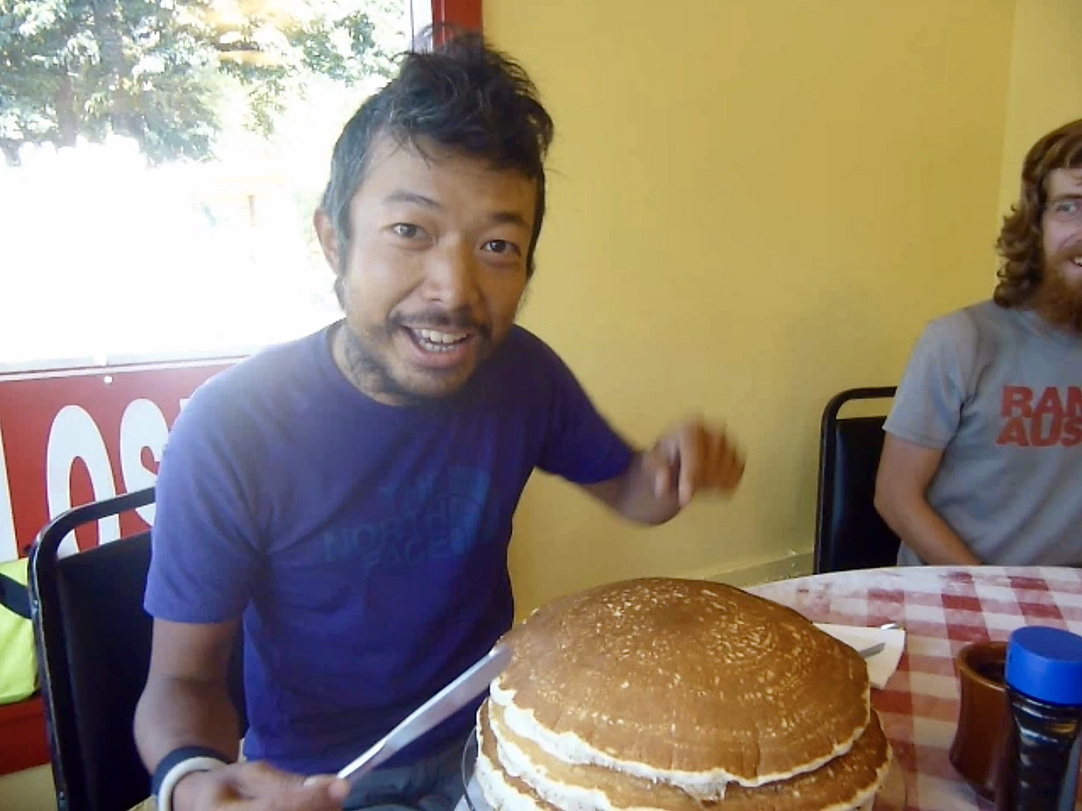 僕は別に大食いが得意なわけでもなければ、パンケーキが大好物というわけでもない。これまで挑戦したこともない。でも、このときばかりは妙に自信があった。というのも、すでに4カ月ほど歩き続けてきて (ここ最近は毎日30km以上)、食欲のリミッターが完全に壊れていたのだ。ピザのLサイズならひとりでぺろり。よく見るタッパーのアイスクリーム (約1.42L) だっていけそうな気がする。胃袋が怪物化していた。だからこそ思った。「あれ? オレ、いけるんじゃないか?」