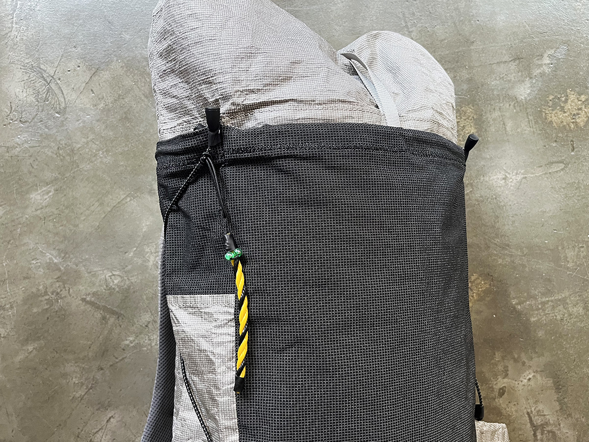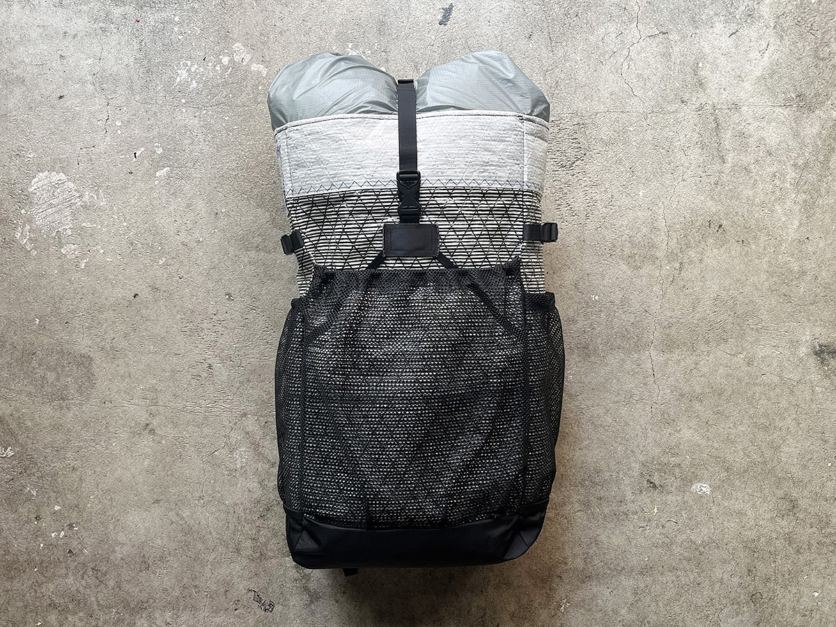 他にも工夫した点としては、フロントポケットは、濡れたツエルトを入れられるように、メッシュの生地で作りました。あとバックパックの中身のボリュームアップに耐えられるように、エクステンション (吹き流し) で容量を拡張できるようにしています。
