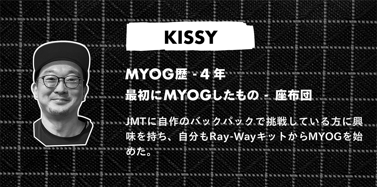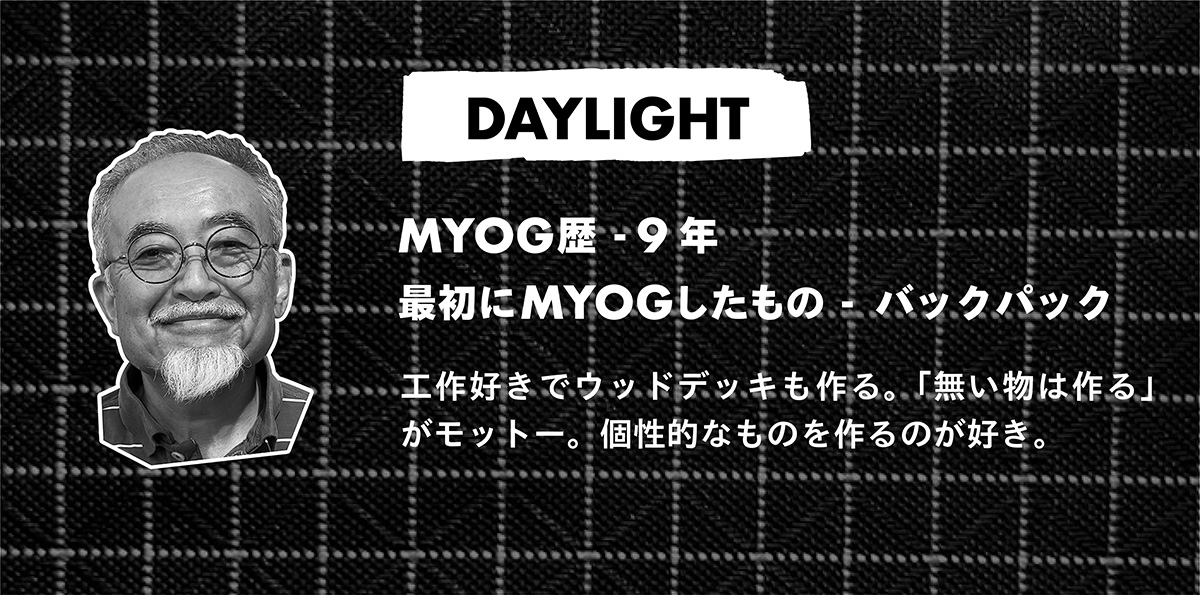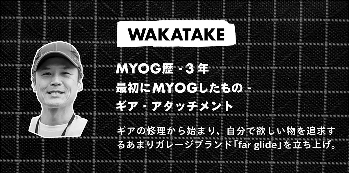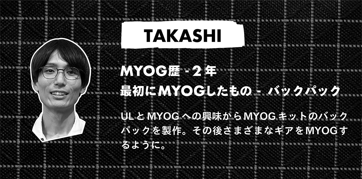 TAKASHI:MYOGを始めて2年くらいなのですが、バックパックから始めて、タープ、シュラフ、ビヴィや、その他にも小物などいろんなものをMYOGするようになりました。