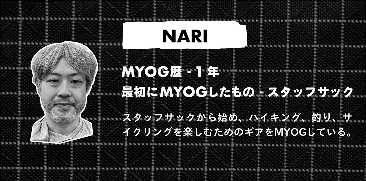 山歩きを始めて1年弱くらい経った頃に、ULとMYOGを知る。既製品を買い足していくか、ミシンを買うか迷った結果、後者を選びMYOGの道へ。もともと手先を動かすのも好きだった。最初にバックパックのMYOGキットから始めて、その後、タープ、シュラフも作ったりと、楽しいMYOGの沼に浸かっている。