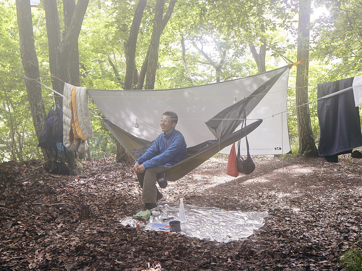 虫対策のため、タープ&バグネットまでセットになったオールインワンのHENNESSY HAMOCKをセレクトしたササキさん。