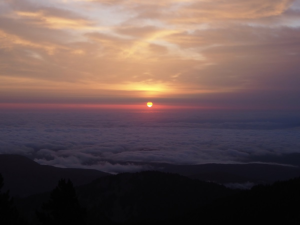 6時半にテントから顔を出すと、外の世界は薄橙色に染まっていた。ヒュッテ裏に行ってみると、雲海から顔を出した朝日が空を赤橙色に照らしていた。この旅で一番のサンライズ。余韻に浸りながらモーニングコーヒーを飲み、ヒュッテを後にした。