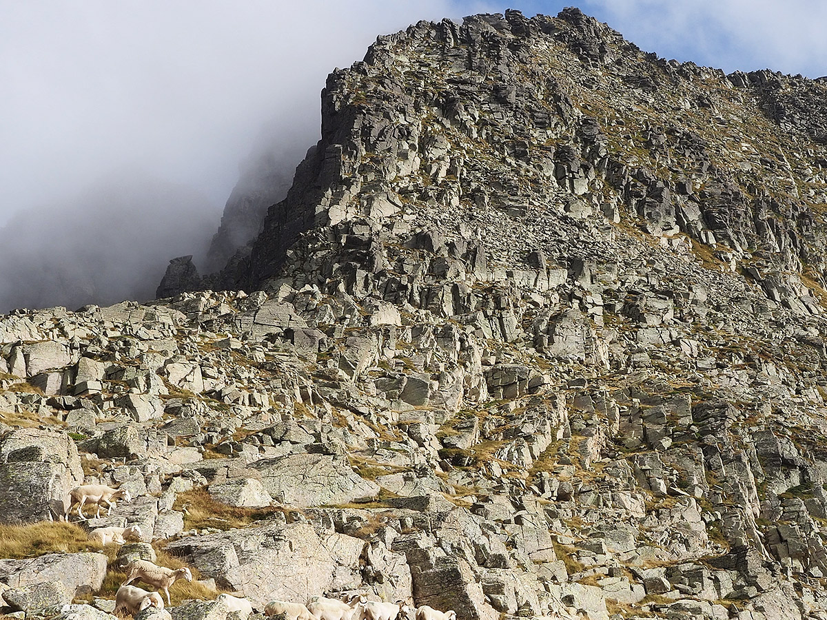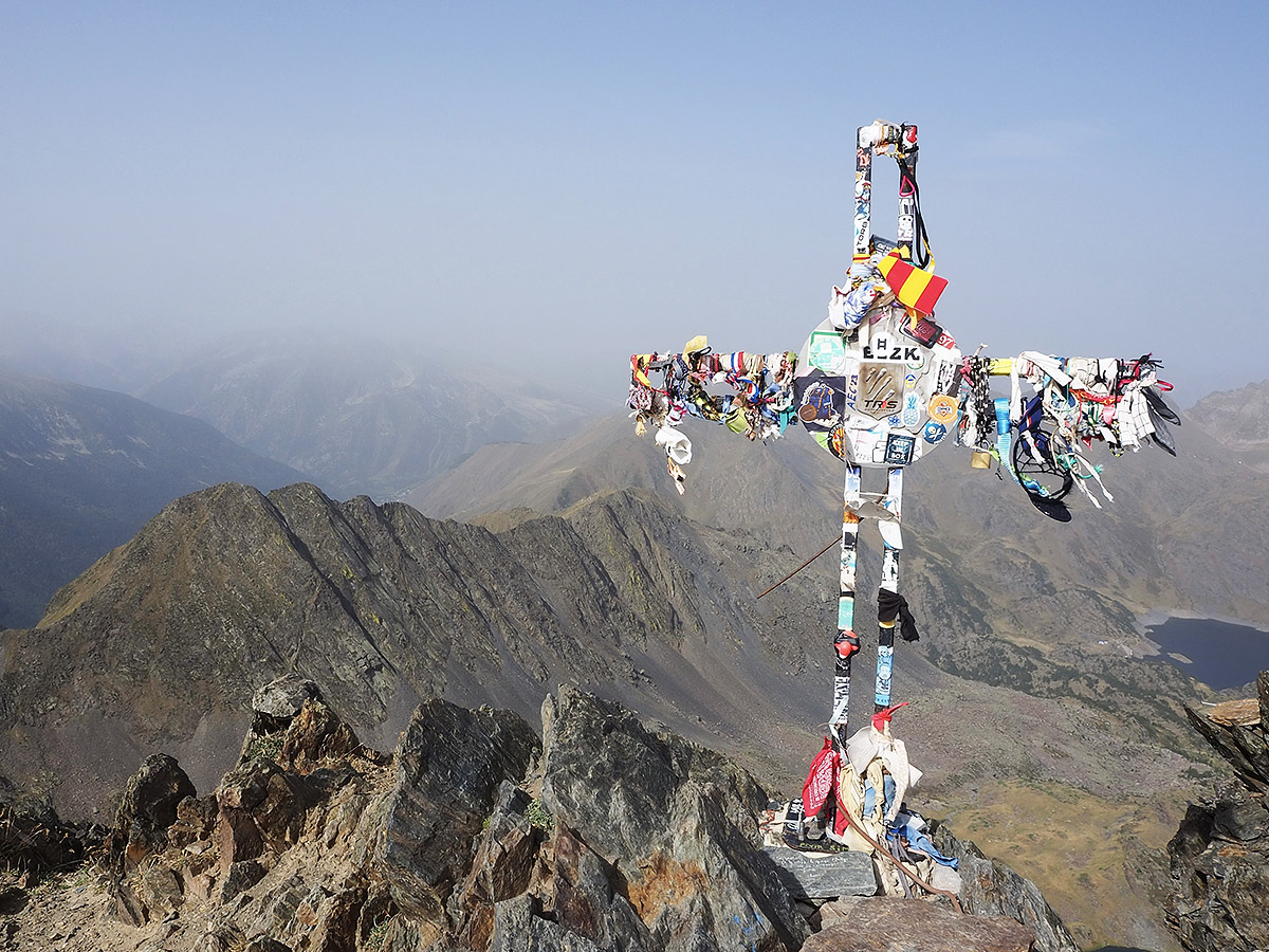 緩やかな上りから始まったが、徐々に急になり、道もザレてきた。トラバースやつづら折りを慎重に進み、標高2,921mのカーリット山 (Pic Carlit) に到着。白く霞んだ景色が、周囲の山々を冷酷にしているように見える。おそらくヘキサトレック史上最高地点であろうから、頂上にある十字架とバッチリ記念撮影。