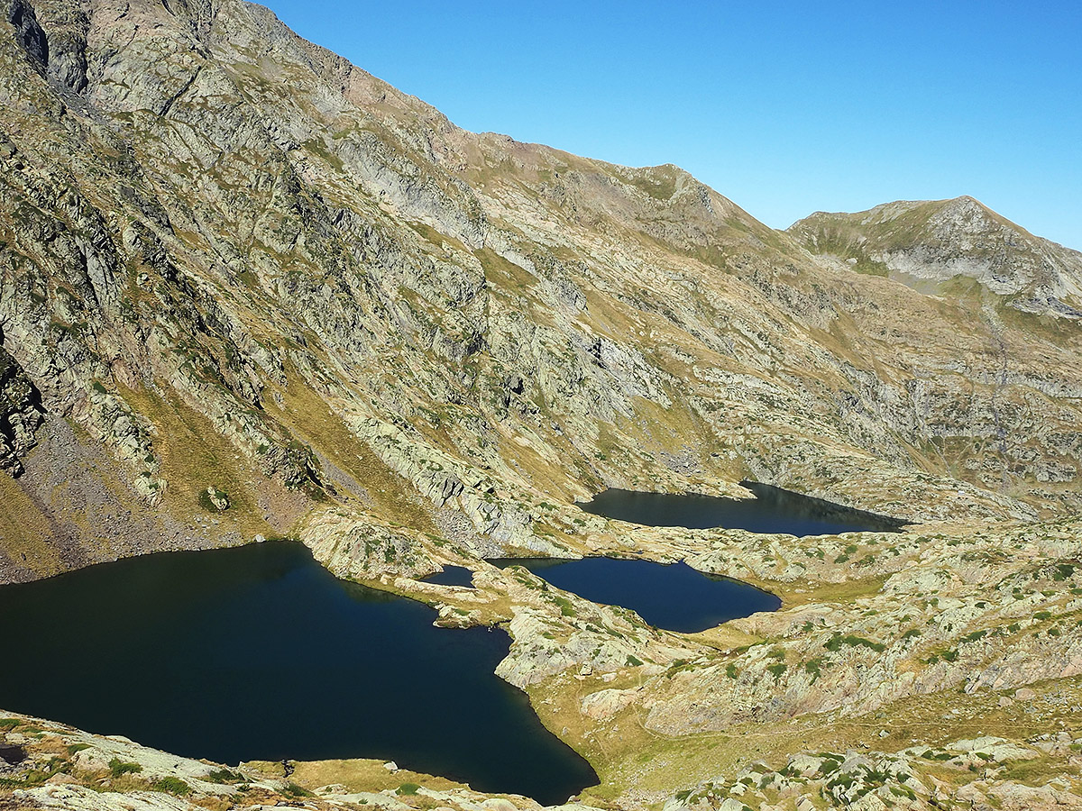 今日もガレ場が多めでさらに気持ちが落ちる。しかし、2つ目の峠から見えたトルト・デ・リウス湖 (Lac Tort de Rius) を見た時、「こりゃ日本じゃ見れない唯一無二のヤツだ」とお手上げの眺め。ここまで来た甲斐があったもんだ。