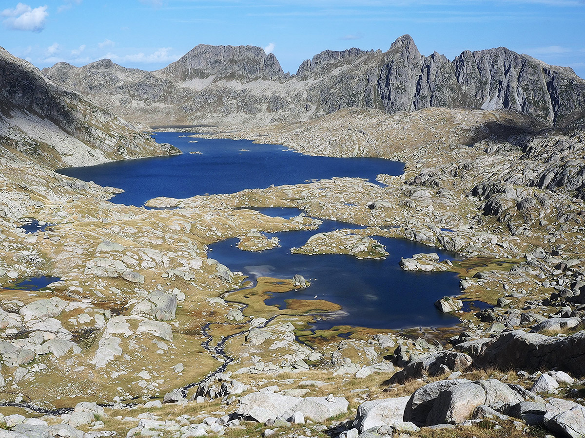 トレースがたまに消え、何度も道をロスト。ザレ場の上りでトレースが消えて危うく別の峠に行きかけた。一筋縄ではいかないHRP。2つ目の峠越えの途中、後ろをふと振り返ると、通過したそれぞれの湖が一望できた。写真に収め、先を急ぐ。