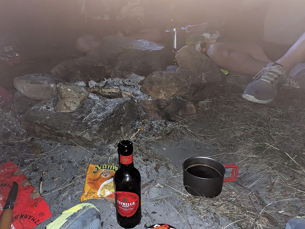 少しのアップダウンを経て、分岐点に到着。そこから少し先にあった山小屋のスペースにテントを張った。目の前に大きな湖があるが暗くて見えないので、パスタを食べて潔く眠りについた。