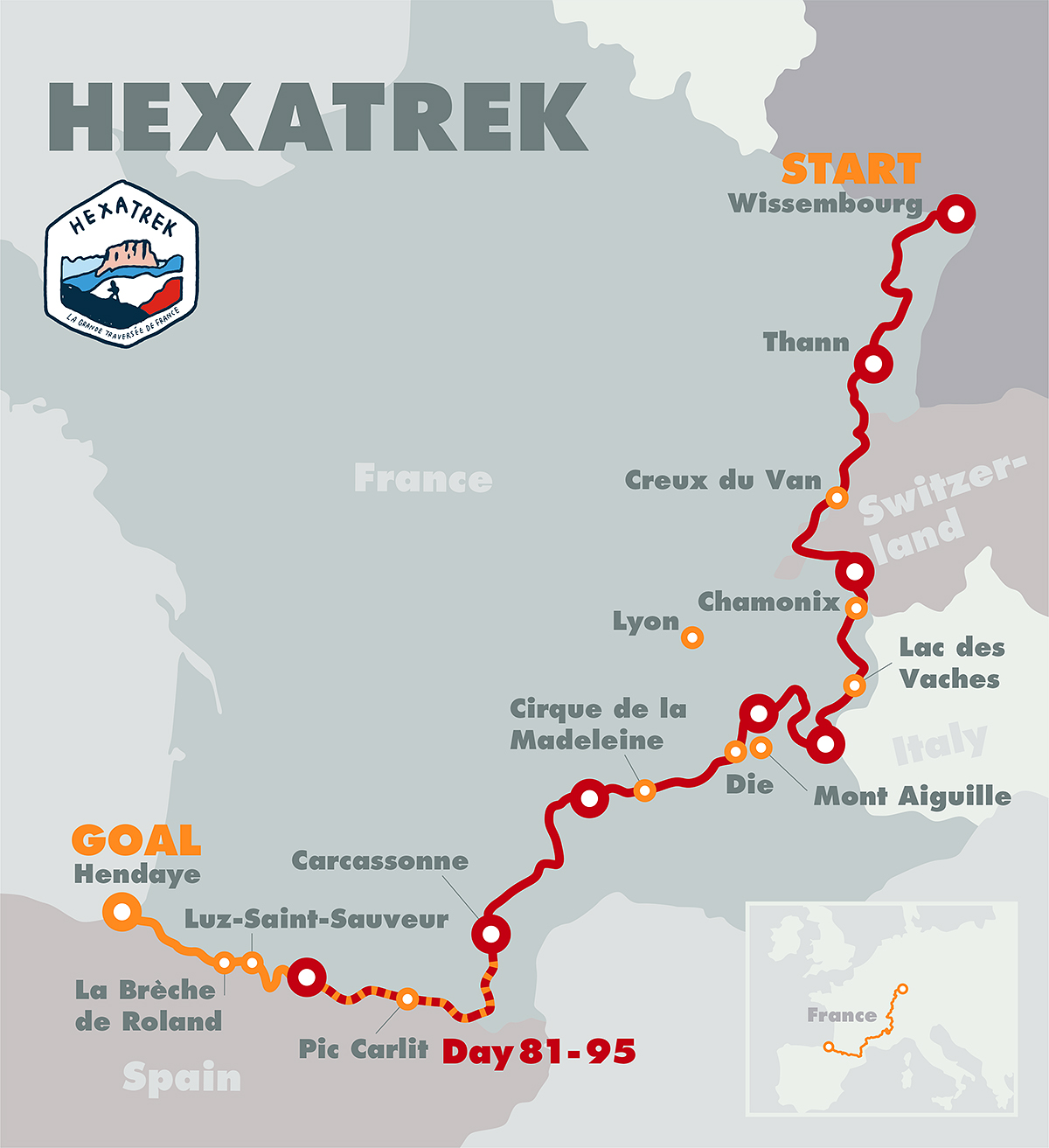 ヘキサトレック:Hexatrek。フランスを中心にアルプスやピレネーの高山地帯、ヨーロッパの田舎町などを通る3,034kmのトレイル。2022年にオフィシャルに開通したばかりで、世界でも日本でもまだ情報が少ないトレイル。スルーハイキングに要する期間は3~5ヶ月。Beyoncéは、北端のヴァイセンブルク (Wissembourg) からスタートして南端のアンダイエ (Hendaye) を目指すSOBO (サウスバウンド) で歩いた。