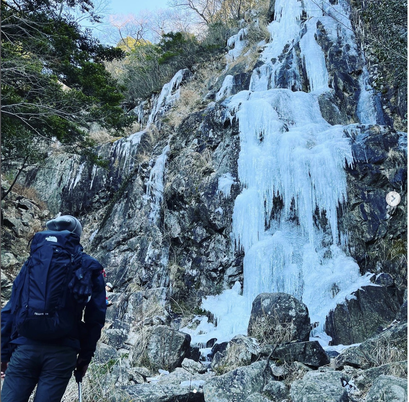「なんやこの滝めっちゃ凍ってるやん!山の中か〜。へ〜、福岡県内にもこんなとこあるんや〜。そんな遠くもないし。」