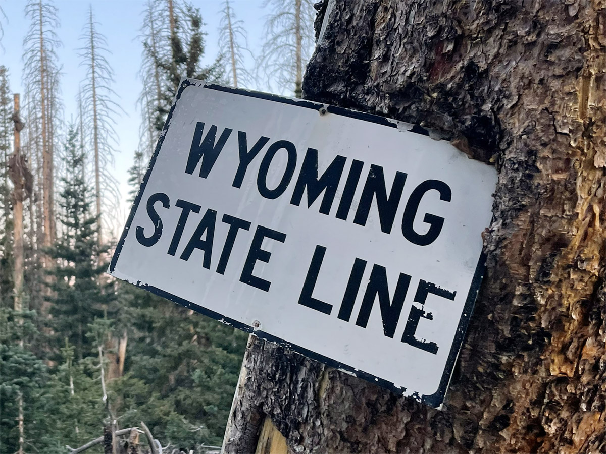 翌朝、早朝の森を歩いていると「WYOMING STATE LINE」と書かれたプレートが木にめり込んでいた。ついに長く単調だったデザートエリアを抜け、全域が高山エリアのコロラド州に入ったのだ。景色の変化に期待が膨らむ。