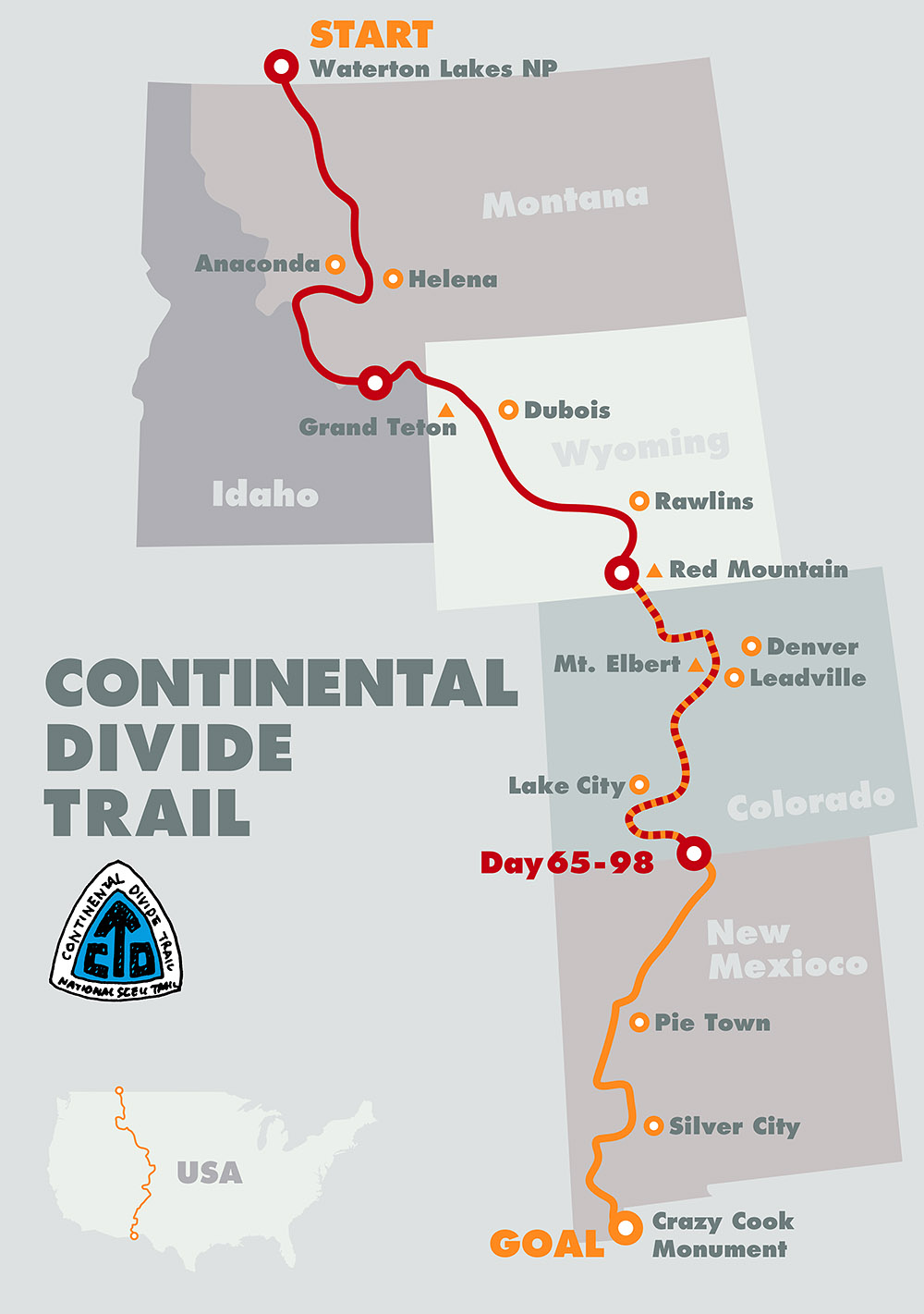 コンチネンタル・ディバイド・トレイル (CDT:Continental Divide Trail)。メキシコ国境からニューメキシコ州、コロラド州、ワイオミング州、アイダホ州、モンタナ州を経てカナダ国境まで、ロッキー山脈に沿った北米大陸の分水嶺を縦断する3,100mile (5,000km) のロングトレイル。アメリカ3大トレイルのひとつ。