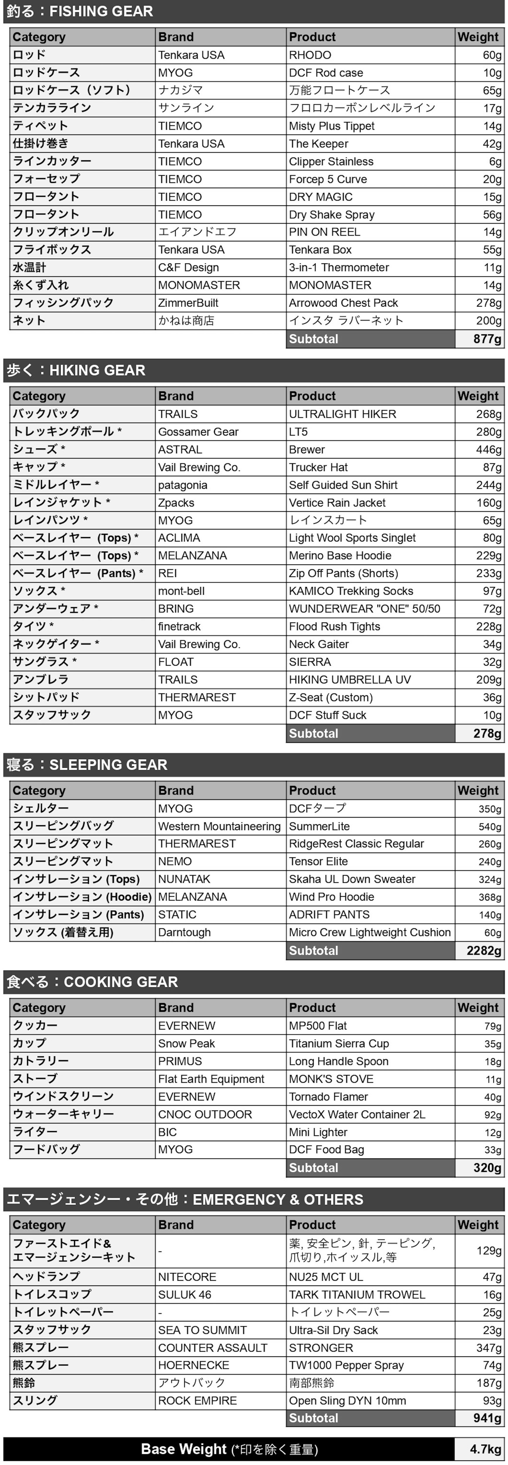 [トレッキングポール *] Gossamer Gear / LT5,[シューズ *] ASTRAL / Brewer,[キャップ *] Vail Brewing Co. / Trucker Hat,[ミドルレイヤー *] patagonia / Self Guided Sun Shirt,[レインジャケット *] Zpacks / Vertice Rain Jacket,[レインパンツ *] MYOG / レインスカート,[ベースレイヤー (Tops) *] ACLIMA / Light Wool Sports Singlet,[ベースレイヤー (Tops) *] MELANZANA / Merino Base Hoodie,[ベースレイヤー (Pants) *] REI / Zip Off Pants (Shorts),[ソックス *] mont-bell / KAMICOトレッキング スプリット トゥ ソックス ,[アンダーウェア *] BRING / WUNDERWEAR “ONE” 50/50,[タイツ *] finetrack / Flood Rush Tights ,[ネックゲイター *] Vail Brewing Co. / Neck Gaiter,[サングラス *] FLOAT / SIERRA,[アンブレラ] TRAILS / HIKING UMBRELLA UV,[シットパッド] THERMAREST / Z-Seat (Custom),[スタッフサック] MYOG / DCF Stuff Suck