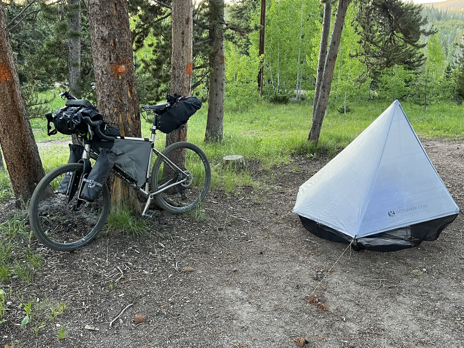 ダウンチューブの下側のJoeyバッグには、170gのプロトタイプテント(後のGossamer Gear / Whisperになるテント ※その開発ストーリーの詳細はコチラ。)、ポリクライオ (※8) のグランドシート、ペグ類を収めていました。
