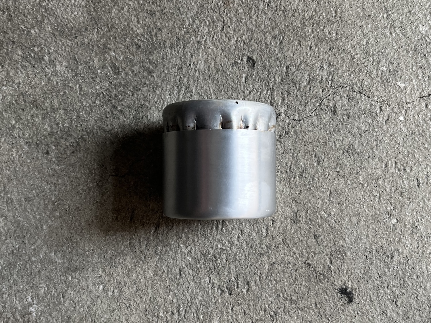 アルコールストーブ (素材: アルミ。重量: 4g。製作時間: 2週間。)