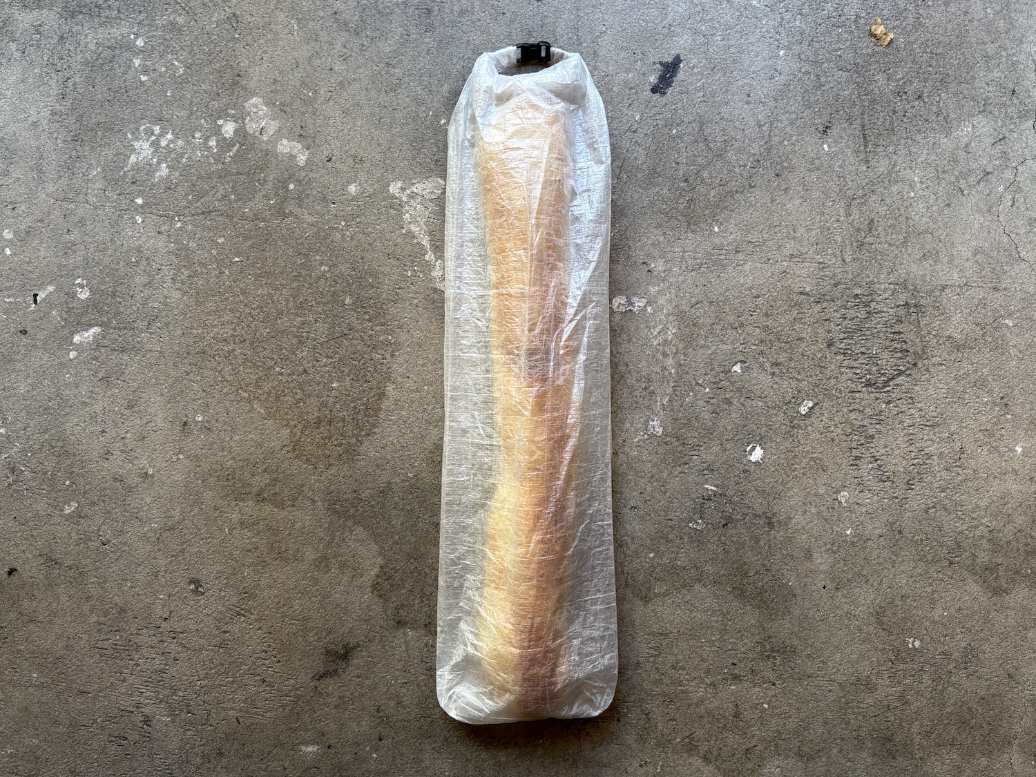 フランスパンサック (素材: ダイニーマ®︎ コンポジット・ファブリック 0.8oz。重量: 8g。製作時間: 1.5時間。)