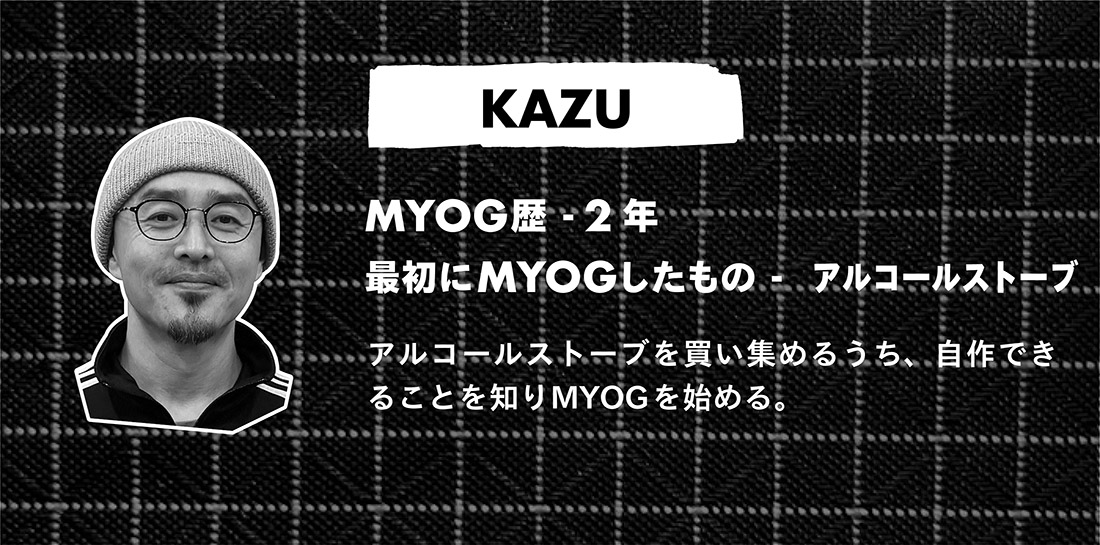 コロナ禍に知人から登山に誘われ、それがきっかけでULに出会う。ULギアの中でもアルコールストーブに興味が湧き、色々と買い集めるうち、自作することができることを知りMYOGを始める。