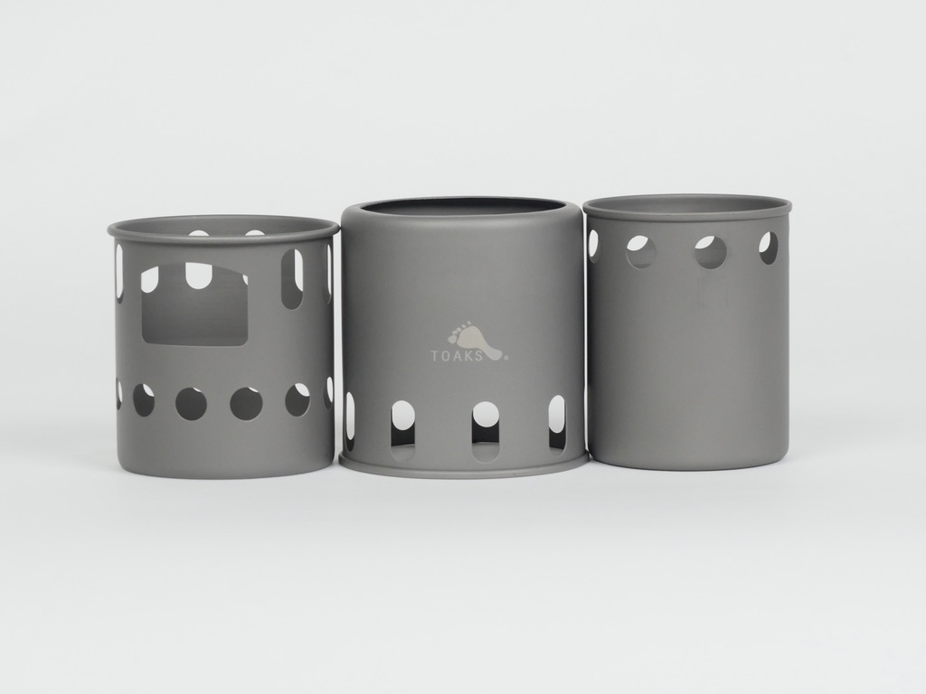 クッカーとスタッキングができるほどコンパクトになるチタン製のウッドストーブ、Titanium Wood Stove Smal。