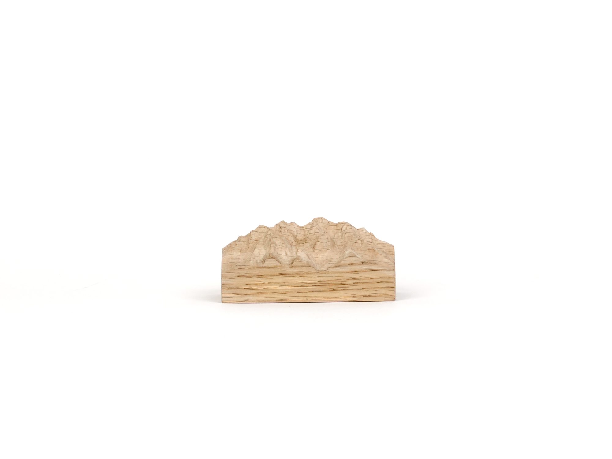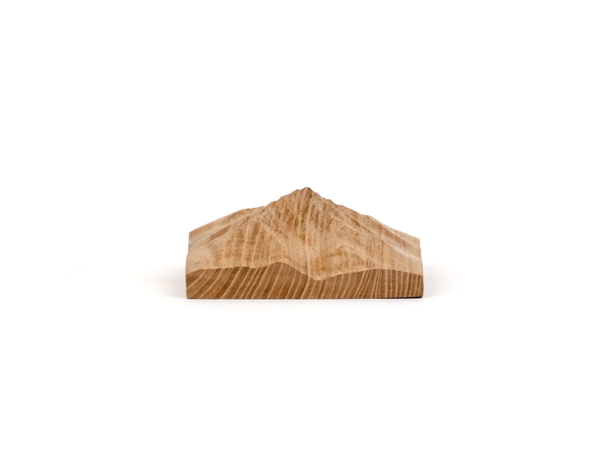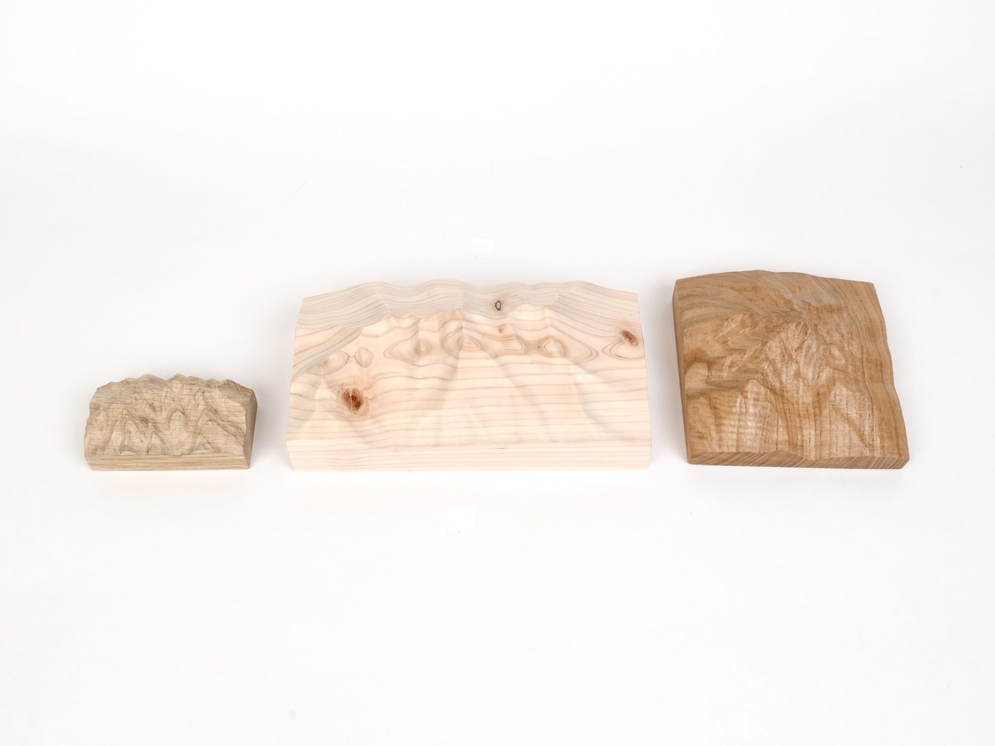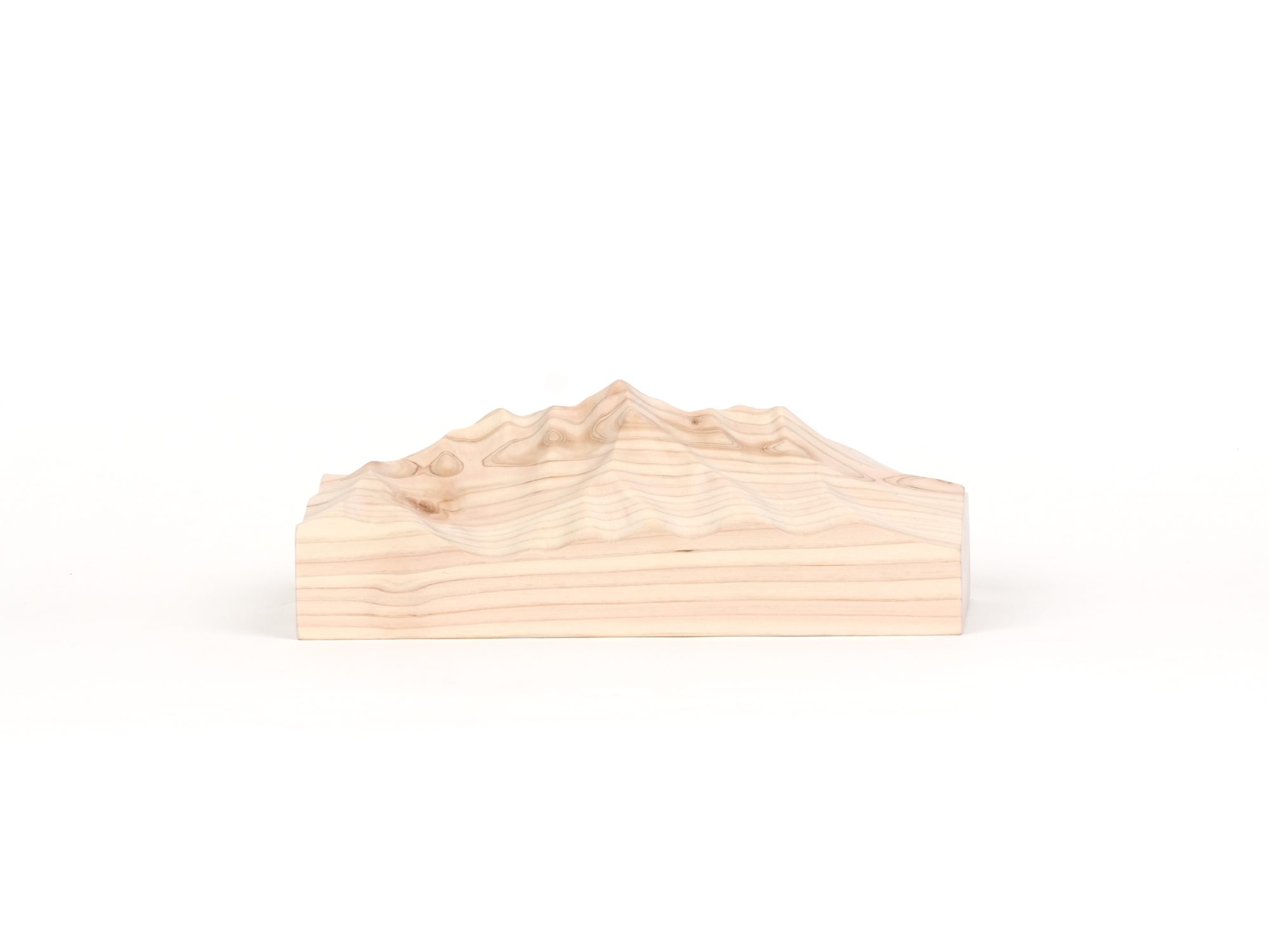 年輪や木目がまるで等高線のように表現されたこのオブジェは、光の当たり方によってその影形を変え違った表情を見せてくれます。