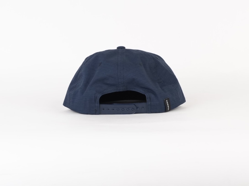 5パネルのリップストップ・コットンツイル製ハット。フィッシュアイパッチがアタッチされ、金属製の留め具付きナイロンストラップでサイズ調整が可能です。つばはフラットタイプで、お好みの形に成形することができます。